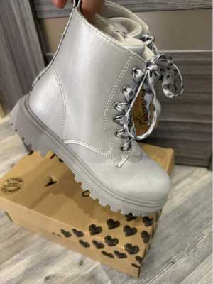 Детские ботинки на девочку. Размер:31. Цвет: серебристый. Ботинке на шнуровке, также по бокам замки.