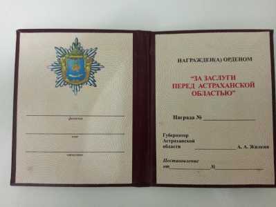 Чистый бланк удостоверения к ордену "За заслуги перед Астраханской областью"